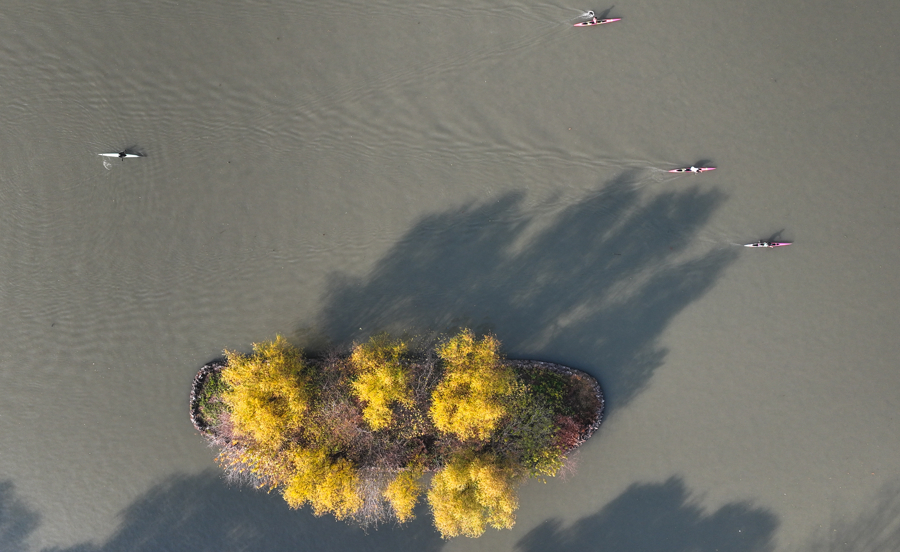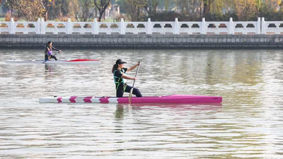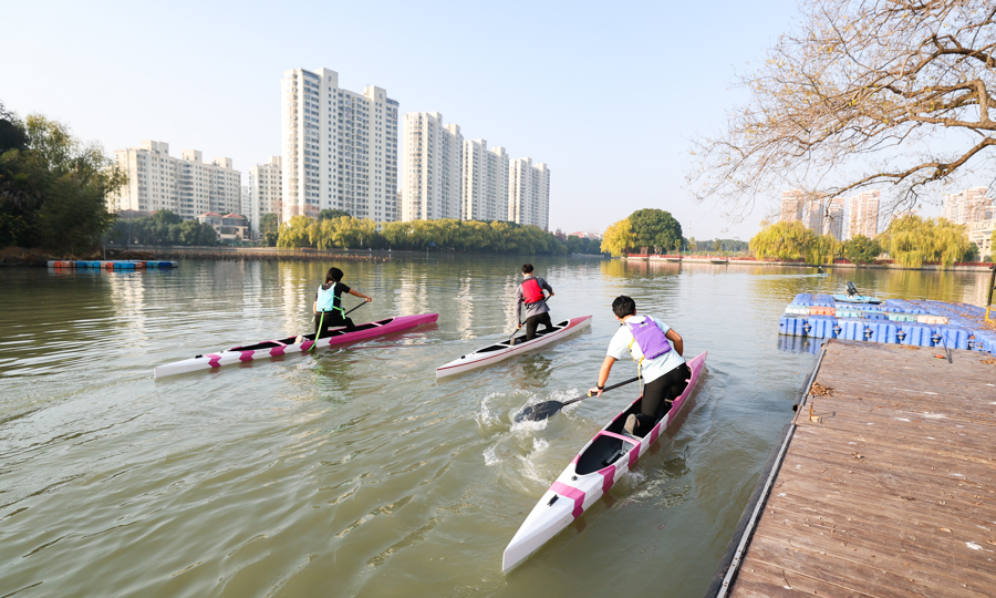 12月21日,松江区通波塘(广富林街道段)水上训练基地内,松江皮划艇队的运动员劈波斩浪,备战上海市第十八届运动会。