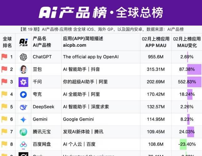 【大河财立方消息】3月3日,AI产品榜发布2026年2月全球总榜,数据显示,全球范围内,MAU(月活用户数)排名前三的AI应用分别为ChatGPT、豆包和千问。其中千问以202.69亿的MAU跻身全球第三大AI应用,增速达552.83%,居全球第一。从榜单看,国内AI应用呈现千问与豆包双雄并立的格局。