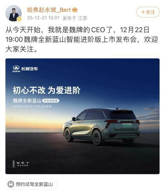 猫头鹰车志讯(ID:owlauto),近日,长城哈弗品牌总经理赵永坡在个人微博发文称,即日起接任魏牌CEO。